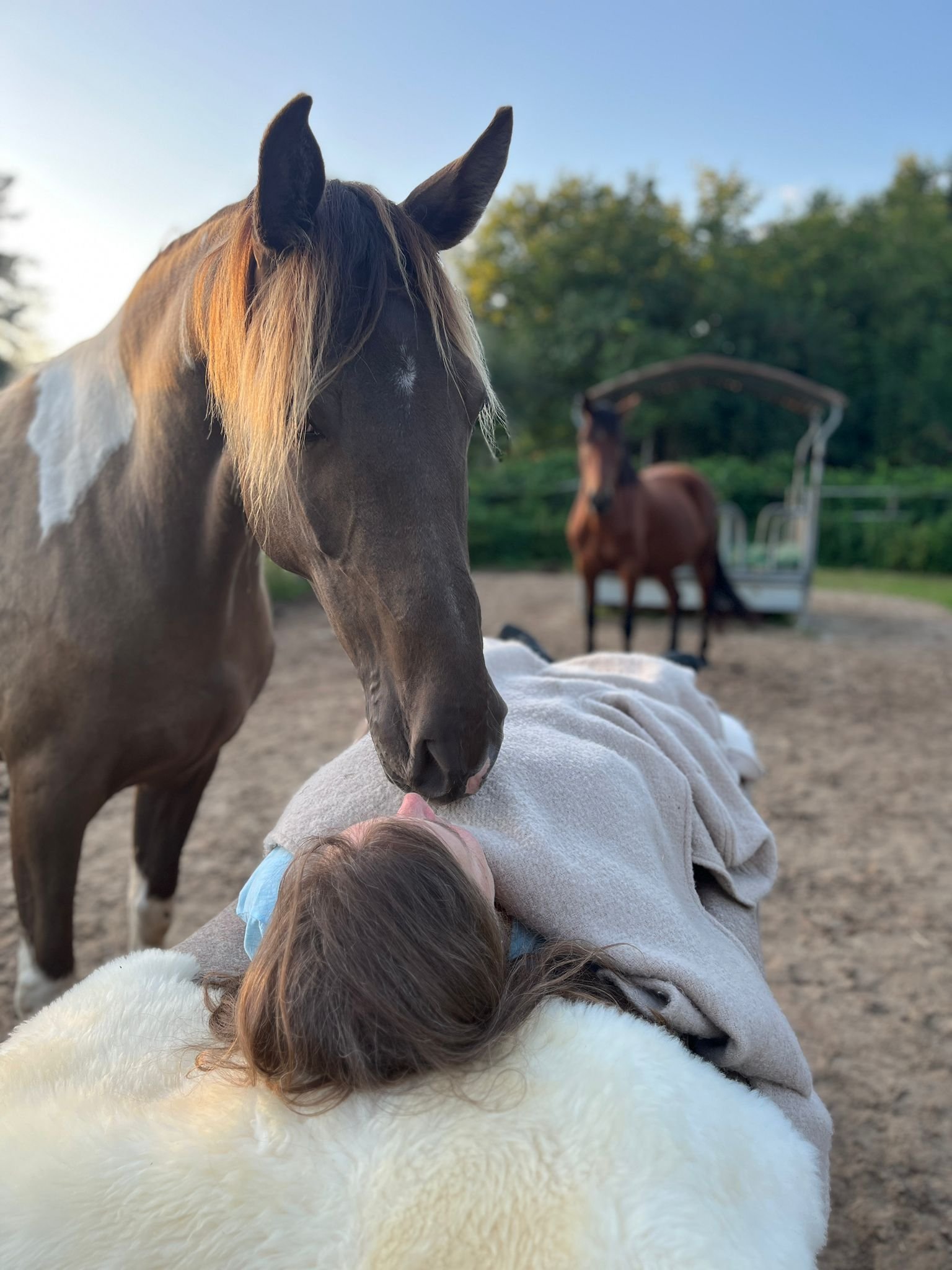Wir fragen nicht, wie es Dir geht und warum Du hier bist. Wir sind einfach da. Spüren, schnuppern, spitzen unsere Ohren. Vielleicht hast du eine Last zu tragen oder dein Weg ist schwierig. Vielleicht fragst du dich, wohin er führt oder bist ratlos, wie es weiter geht. Vom Pferderücken kannst du ein Stück weiter sehen. Wir sind stark. Wir können Dir helfen, es auch (wieder) zu sein. Lass uns ein Stück zusammen gehen. Du kannst dich anlehnen, dich tragen lassen, oder einfach bei uns im Gras sitzen.